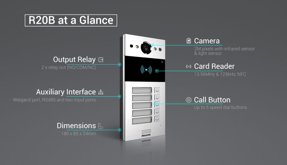 ویژگیهای منحصر به فرد آیفون تصویری هوشمند R۲۰B آیفون Akuvox مدل R۲۰B دارای دوربین ۲ مگاپیکسلی با قابلیت روشنایی خودکار و دید در شب میباشد. زاویه دید این دروبین، ۱۱۰ درجه افقی و ۵۸ درجه عمودی است. جنس بدنه از آلومینیوم میباشد. که این بدنه دارای استاندارد IP۶۵ (ضد گرد و غبار، خش، ضربه و آب) است. این آیفون دارای سنسورهای حرکتی (برای روشنایی خودکار) و ژیروسکوپ (برای جلوگیری از دزدیده شدن آیفون) میباشد R۲۰B قابلیت کنترل دو درب متفاوت را دارد. علاوه بر دکمه زنگ به روشهای متفاوتی میتوانیم درب را باز کنیم. این روش ها عبارتند از کارت RFID، دستگاههای Acssess control یا همان اثر انگشت و گوشی تلفن همراه.